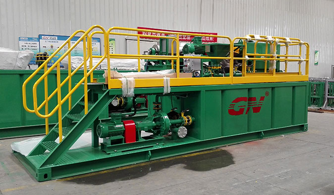 泥漿固控系統中的主體設備 本套泥漿固控系統的主體分離設備為一臺GNZS752新型泥漿振動篩和一臺GNLW223臥螺式沉降離心機。經過以上兩臺分離設備的處理后,可以將泥漿中的細小顆粒分離出來,從而得到凈化的泥漿。加裝一臺射流混漿料斗和混合泵以后,就可以完成井隊泥漿的混配。客戶只要再匹配一臺發電機就可以實現泥漿固控系統的施工。